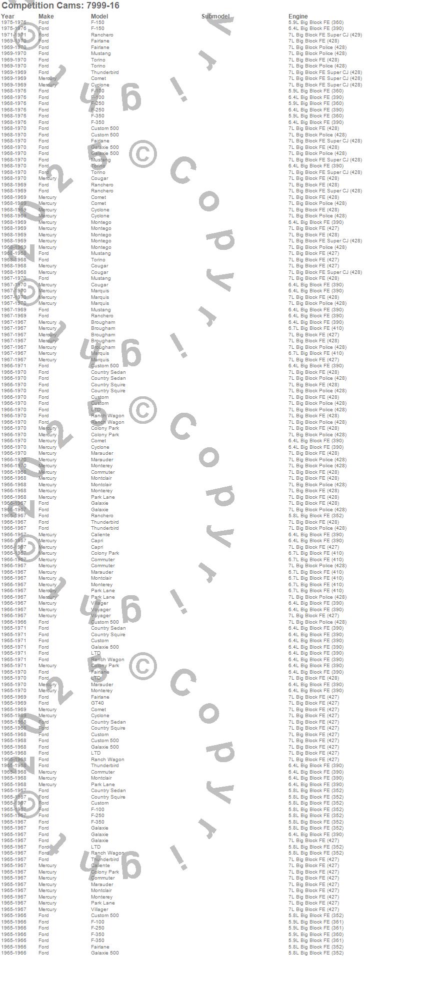 Breezeway, Brougham, Caliente, Colony Park, Comet, Commuter, Cougar, Country Sedan, Country Squire, Custom, Custom 500, Cyclone, F-100, F-150, F-250, F-350, F-500 Pickup, Fairlane, Galaxie, Galaxie 500