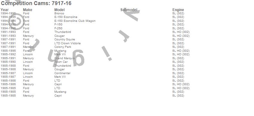 Bronco, Capri, Colony Park, Continental, Cougar, Country Squire, E-150 Econoline, E-150 Econoline Club Wagon, F-150, F-250, Grand Marquis, LTD, LTD Crown Victoria, Mark VI, Mark VII, Marquis, Mustang, Thunderbird, Town Car, Ford
