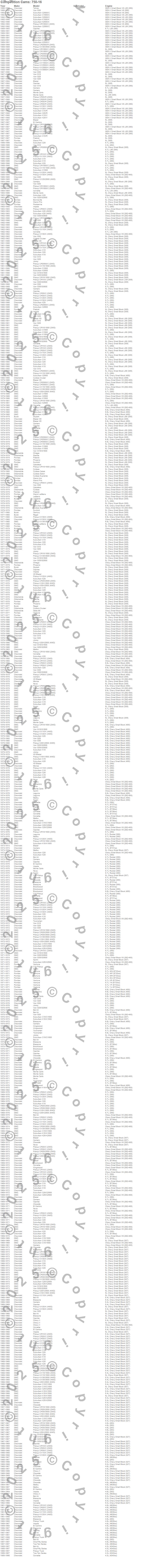 Bel Air, Biscayne, Blazer, Blazer K5, Bonneville, Brookwood, C10 Pickup, C10 Suburban, C15 Suburban, C15/C1500 Suburban, C1500 Pickup, C1500 Suburban, C20 Pickup, C20 Suburban, C25 Suburban, C25/C2500 Pickup, C25/C2500 Suburban, C2500 Pickup, C2500 Suburban, C30 Pickup