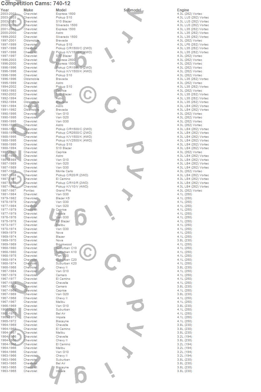 Astro, Bel Air, Biscayne, Blazer, Blazer K5, Bravada, Brookwood, C10 Suburban, C1500 Pickup, C20 Suburban, C2500 Pickup, Camaro, Caprice, Chevelle, Chevy II, El Camino, Express 1500, Express 2500, G10 Van, G20 Van