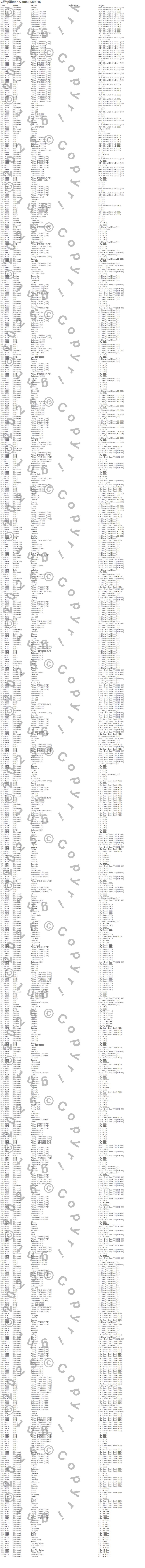 Bel Air, Biscayne, Blazer, Blazer K5, Bonneville, Brookwood, C10 Pickup, C10 Suburban, C15 Suburban, C15/C1500 Suburban, C1500 Pickup, C1500 Suburban, C20 Pickup, C20 Suburban, C25 Suburban, C25/C2500 Pickup, C25/C2500 Suburban, C2500 Pickup, C2500 Suburban, C30 Pickup