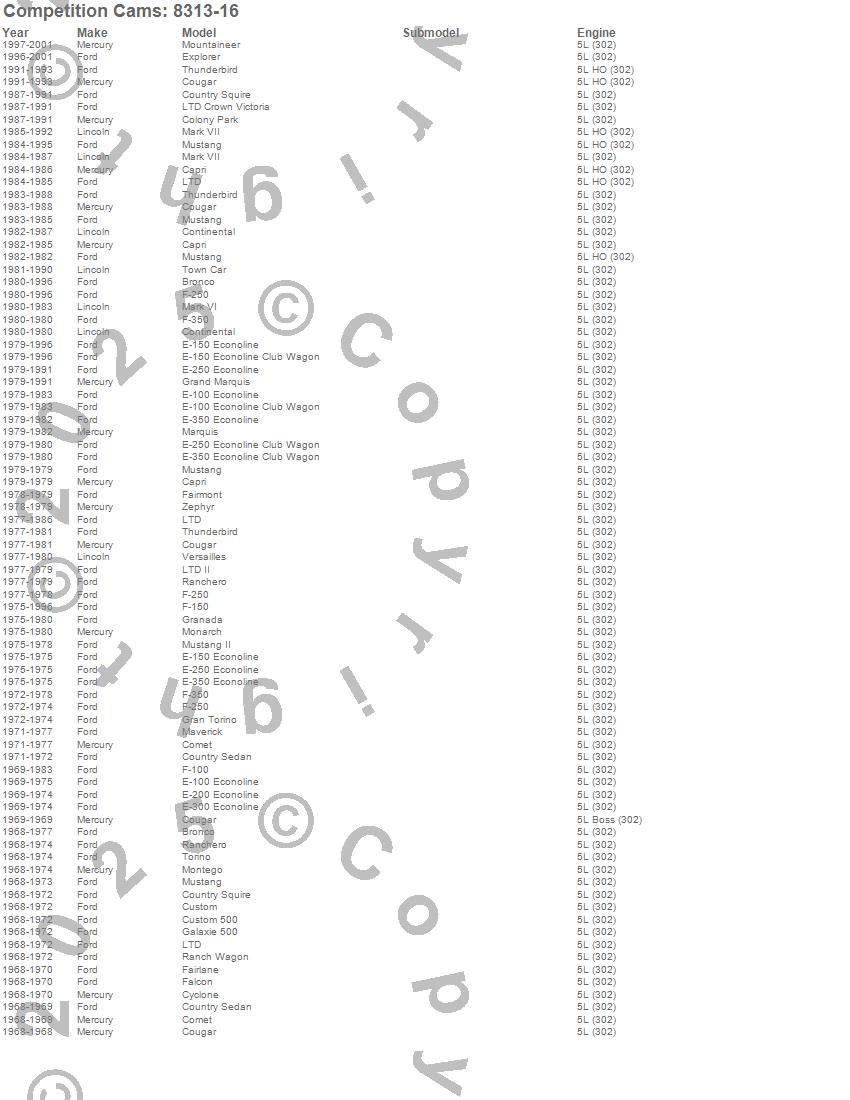 Bronco, Capri, Colony Park, Comet, Continental, Cougar, Country Sedan, Country Squire, Custom, Custom 500, Cyclone, E-100 Econoline, E-100 Econoline Club Wagon, E-150 Econoline, E-150 Econoline Club Wagon, E-200 Econoline, E-250 Econoline, E-300 Econoline, E-350 Econoline, Explorer