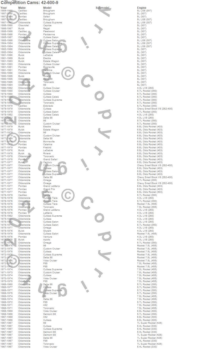 442, 98, Apollo, Bonneville, Brougham, Caprice, Catalina, Century, Custom Cruiser, Cutlass, Cutlass Calais, Cutlass Cruiser, Cutlass Salon, Cutlass Supreme, Cutlass Tiara, Delmont 88, Delta 88, Eldorado, Electra, Estate Wagon