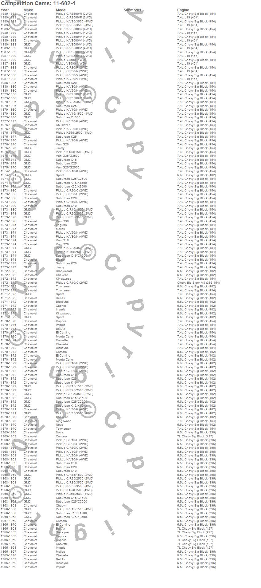 Bel Air, Biscayne, Blazer, Blazer K5, Brookwood, C10 Pickup, C10 Suburban, C15 Suburban, C15/C1500 Suburban, C1500 Pickup, C1500 Suburban, C20 Pickup, C20 Suburban, C25 Suburban, C25/C2500 Pickup, C25/C2500 Suburban, C2500 Pickup, C2500 Suburban, C30 Pickup, C35/C3500 Pickup