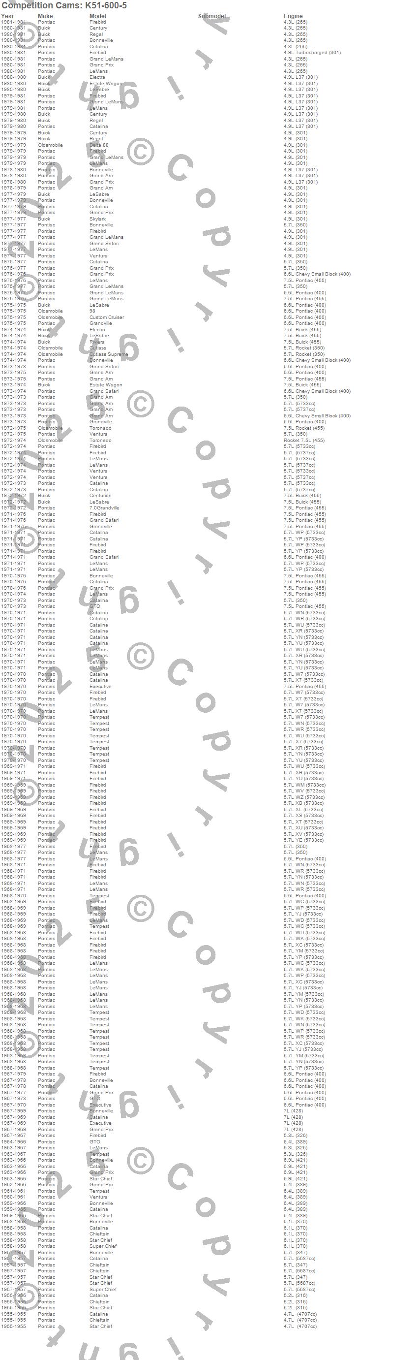 98, Bonneville, Catalina, Catalina Ventura, Centurion, Century, Chieftain, Custom Cruiser, Cutlass, Cutlass Supreme, Delta 88, Electra, Estate Wagon, Executive, Firebird, Firebird Trans Am, Grand Am, Grand LeMans, Grand Prix, Grand Safari