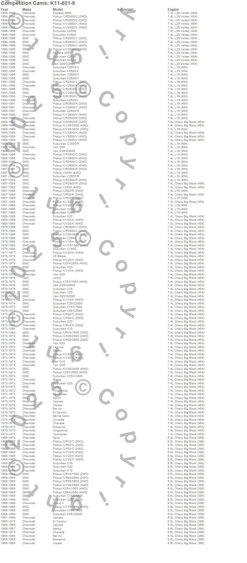 Bel Air, Biscayne, Blazer, Blazer K5, C10 Pickup, C10 Suburban, C15 Suburban, C15/C1500 Suburban, C1500 Pickup, C1500 Suburban, C20 Pickup, C20 Suburban, C25 Suburban, C25/C2500 Pickup, C25/C2500 Suburban, C2500 Pickup, C2500 Suburban, C30 Pickup, C35/C3500 Pickup, C3500 Pickup