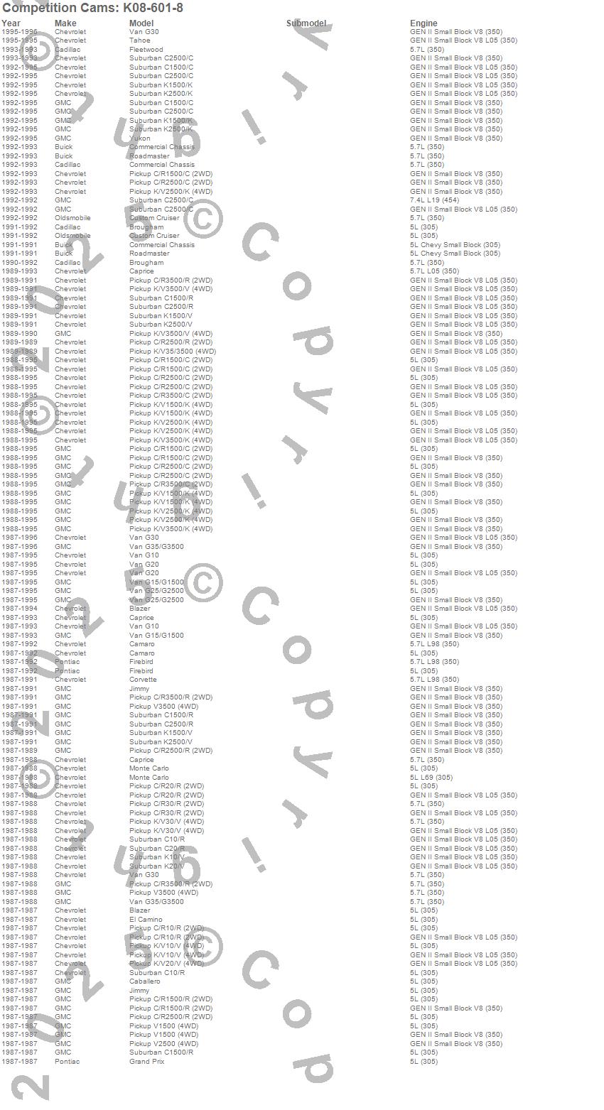 Blazer, Brougham, C1500 Pickup, C1500 Suburban, C2500 Pickup, C2500 Suburban, C3500 Pickup, Caballero, Camaro, Caprice, Commercial Chassis, Corvette, Custom Cruiser, El Camino, Firebird, Fleetwood, G10 Van, G15/G1500 Van, G20 Van, G25/G2500 Van