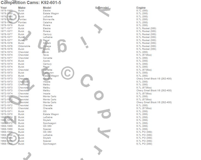 Apollo, Bonneville, Catalina, Centurion, Century, Chevelle, Corvette, Electra, Estate Wagon, GS, GS 350, Impala, LeSabre, Malibu, Monte Carlo, Nova, Omega, Regal, Riviera, Skylark