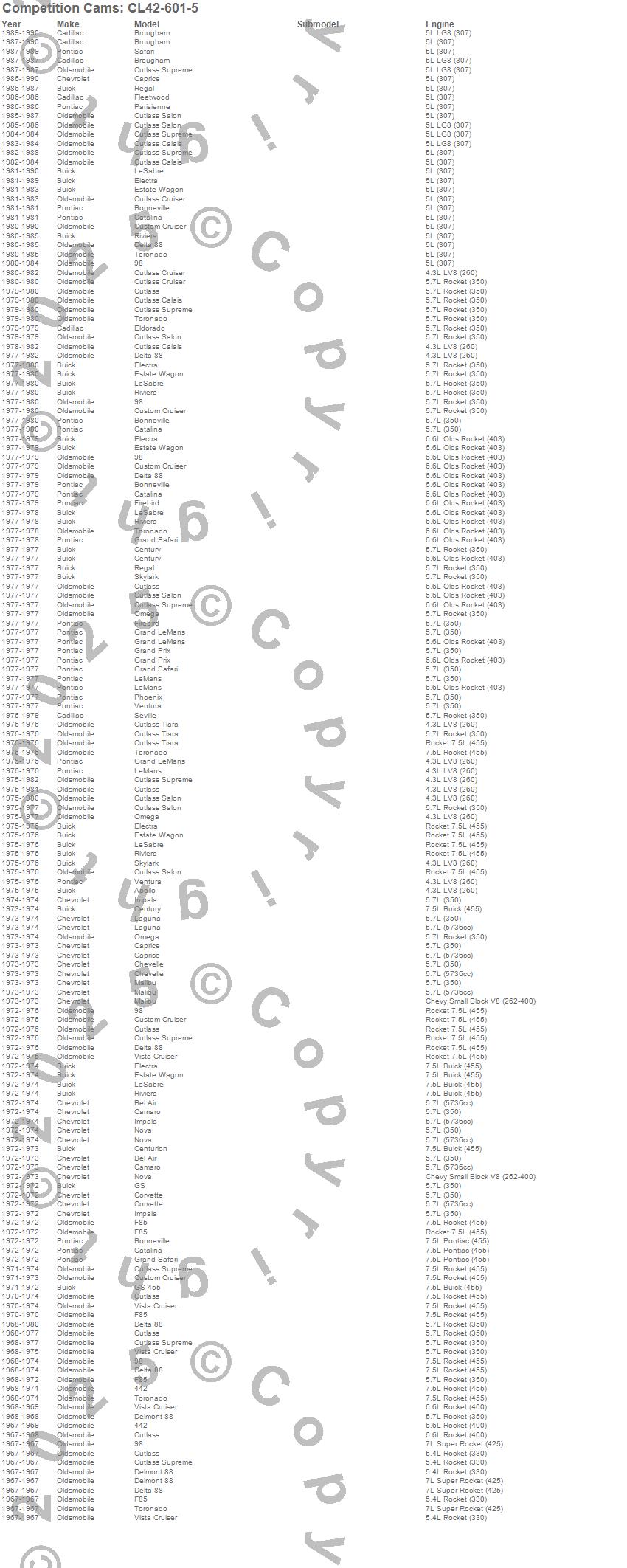 442, 98, Apollo, Bel Air, Bonneville, Brougham, Camaro, Caprice, Catalina, Centurion, Century, Chevelle, Corvette, Custom Cruiser, Cutlass, Cutlass Calais, Cutlass Cruiser, Cutlass Salon, Cutlass Supreme, Cutlass Tiara
