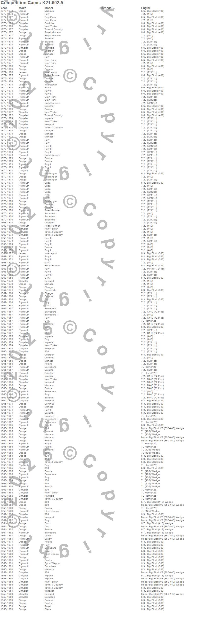 300, 330, 440, 880, Barracuda, Belvedere, Belvedere II, Challenger, Charger, Cordoba, Coronet, Cuda, Custom, Dart, Fleet Special, Fury, Fury I, Fury II, Fury III, Gran Fury