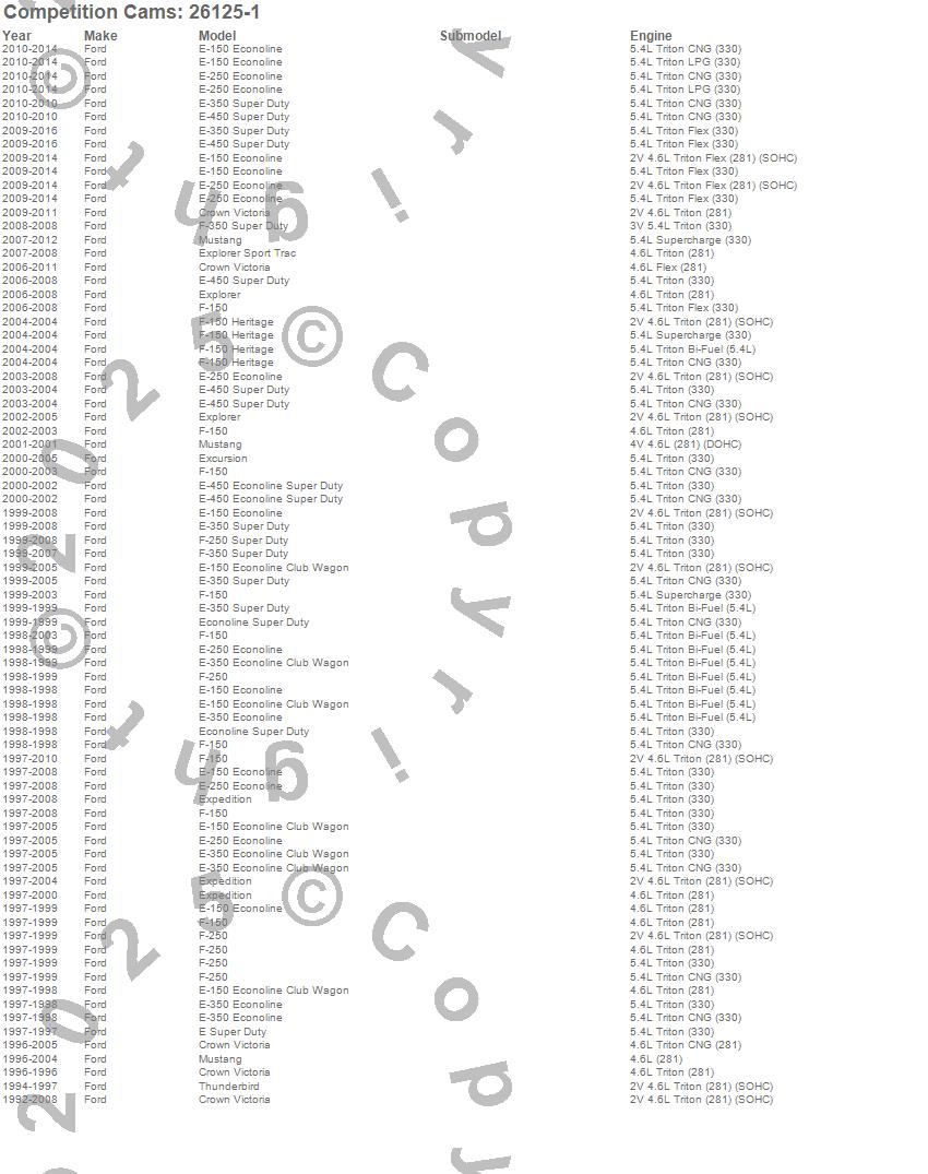 Crown Victoria, E Super Duty, E-150 Econoline, E-150 Econoline Club Wagon, E-250 Econoline, E-350 Econoline, E-350 Econoline Club Wagon, E-350 Super Duty, E-450 Econoline Super Duty, E-450 Econoline Super Duty Stripped, E-450 Super Duty, E-450 Super Duty Stripped Chassis, Econoline Super Duty, Excursion, Expedition, Explorer, F-150, F-150 Heritage, F-250, F-250 Super Duty