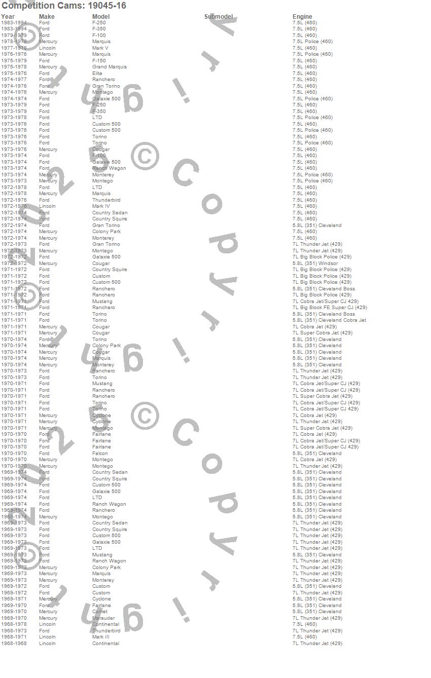 Colony Park, Comet, Continental, Cougar, Country Sedan, Country Squire, Custom, Custom 500, Cyclone, Elite, F-100, F-150, F-250, F-350, Fairlane, Falcon, Galaxie 500, Gran Torino, Grand Marquis, LTD