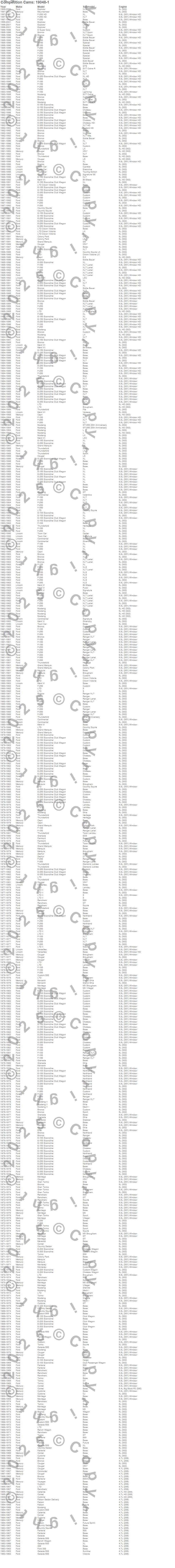 Bronco, Caliente, Capri, Club Cargo, Colony Park, Comet, Commuter, Continental, Cougar, Country Sedan, Country Squire, Custom, Custom 500, Cyclone, E Super Duty, E-100 Econoline, E-100 Econoline Club Wagon, E-150 Econoline, E-150 Econoline Club Wagon, E-200 Econoline
