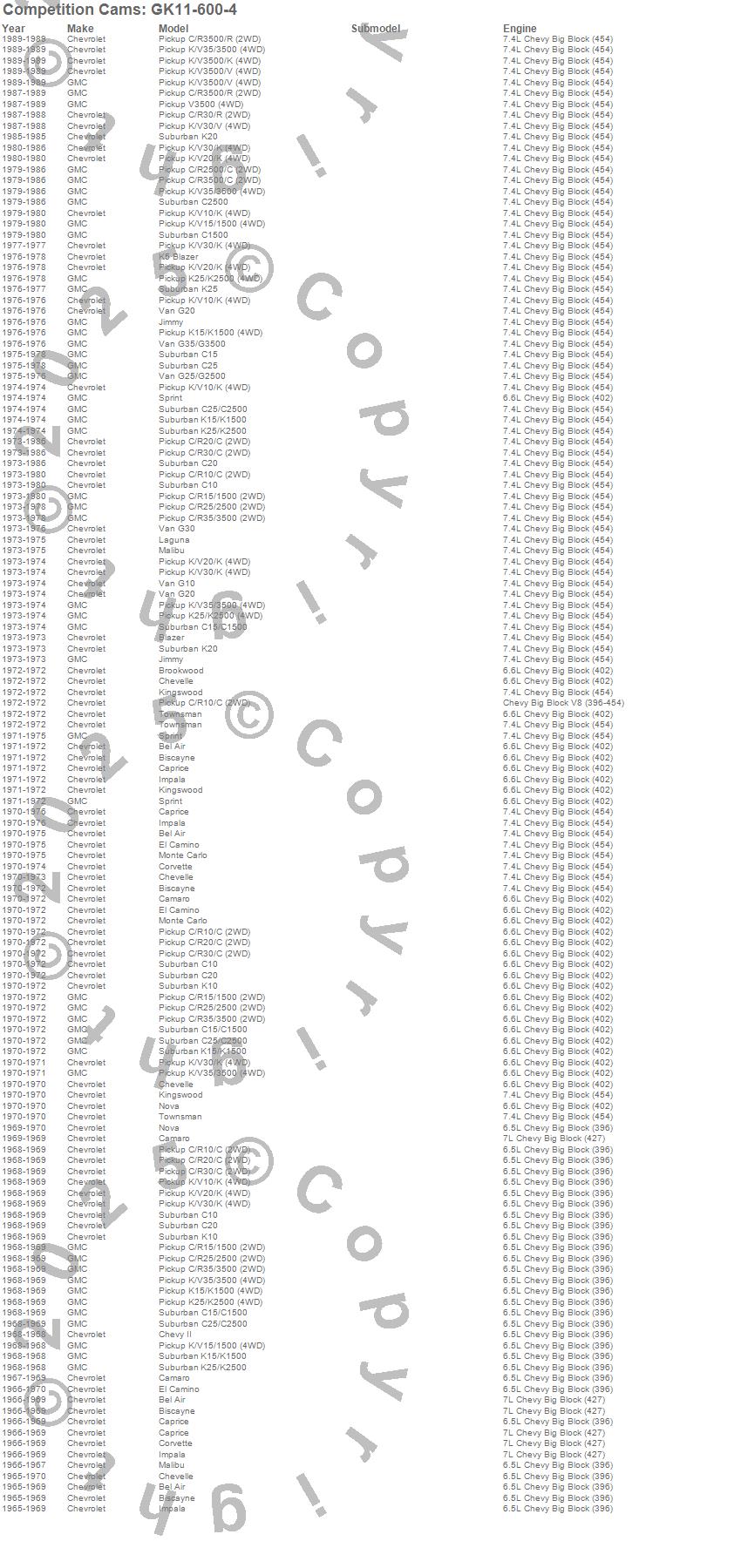 Bel Air, Biscayne, Blazer, Blazer K5, Brookwood, C10 Pickup, C10 Suburban, C15 Suburban, C15/C1500 Suburban, C1500 Pickup, C1500 Suburban, C20 Pickup, C20 Suburban, C25 Suburban, C25/C2500 Pickup, C25/C2500 Suburban, C2500 Pickup, C2500 Suburban, C30 Pickup, C35/C3500 Pickup