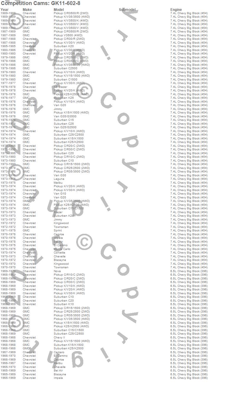 Bel Air, Biscayne, Blazer, Blazer K5, C10 Pickup, C10 Suburban, C15 Suburban, C15/C1500 Suburban, C1500 Pickup, C1500 Suburban, C20 Pickup, C20 Suburban, C25 Suburban, C25/C2500 Pickup, C25/C2500 Suburban, C2500 Pickup, C2500 Suburban, C30 Pickup, C35/C3500 Pickup, C3500 Pickup