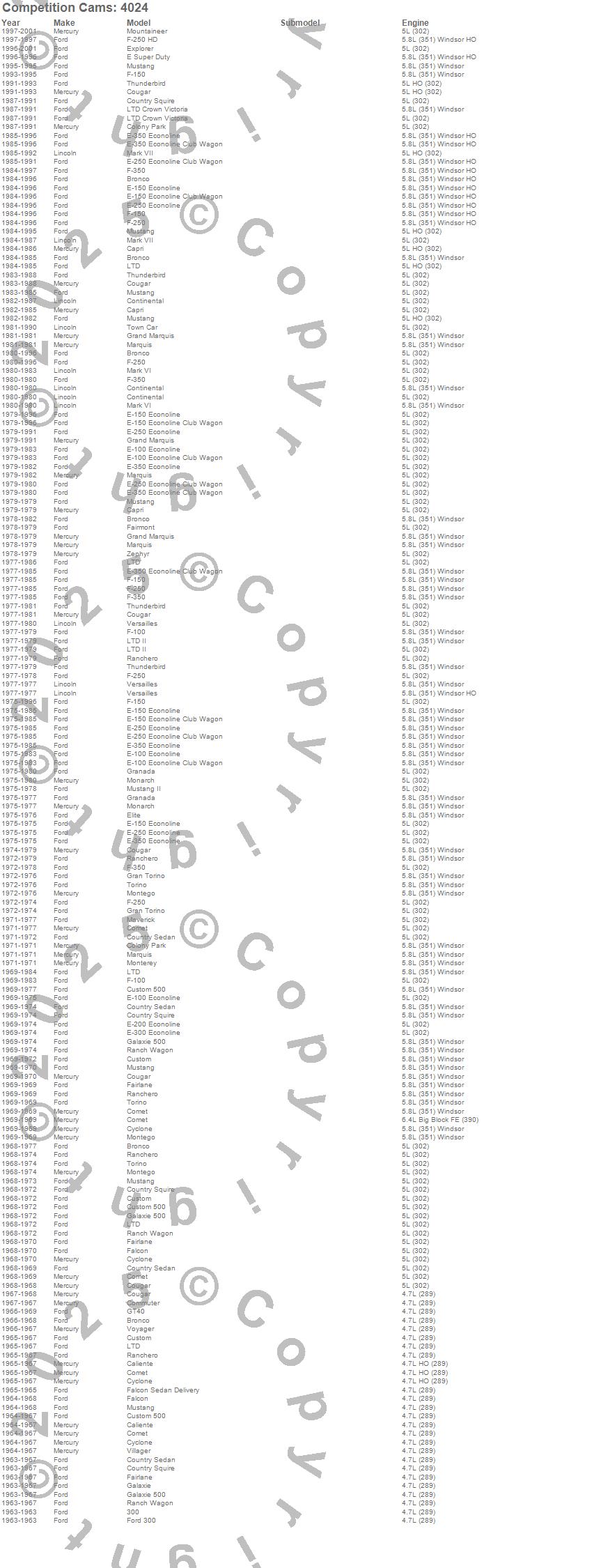 Bronco, Caliente, Capri, Club Cargo, Colony Park, Comet, Commuter, Continental, Cougar, Country Sedan, Country Squire, Custom, Custom 500, Cyclone, E Super Duty, E-100 Econoline, E-100 Econoline Club Wagon, E-150 Econoline, E-150 Econoline Club Wagon, E-200 Econoline