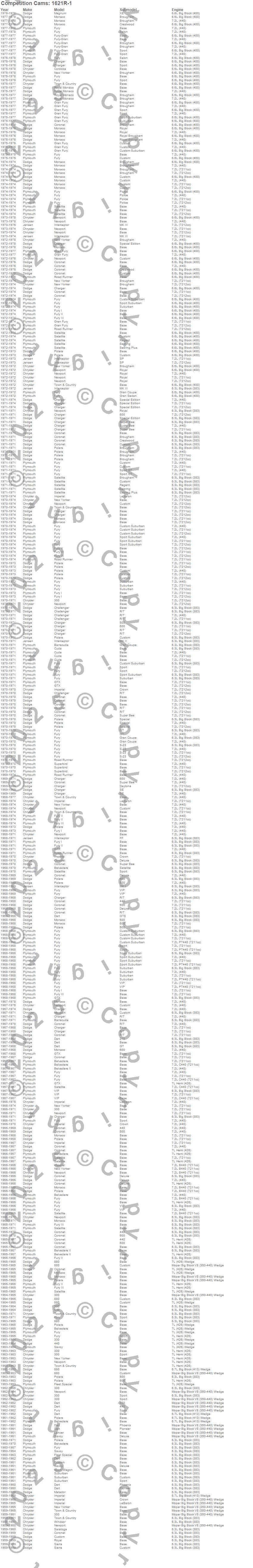 300, 330, 440, 880, Barracuda, Belvedere, Belvedere II, Challenger, Charger, Cordoba, Coronet, Cuda, Custom, Dart, Fleet Special, Fury, Fury I, Fury II, Fury III, Gran Fury