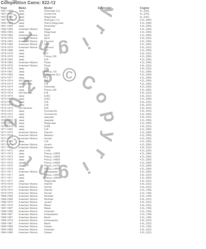 Ambassador, American, AMX, Cherokee (SJ), CJ5, CJ6, CJ7, Classic, Concord, DJ5B, DJ5C, Eagle, Grand Wagoneer, Gremlin, Hornet, J-2500, J-2600, J10, J20, Javelin