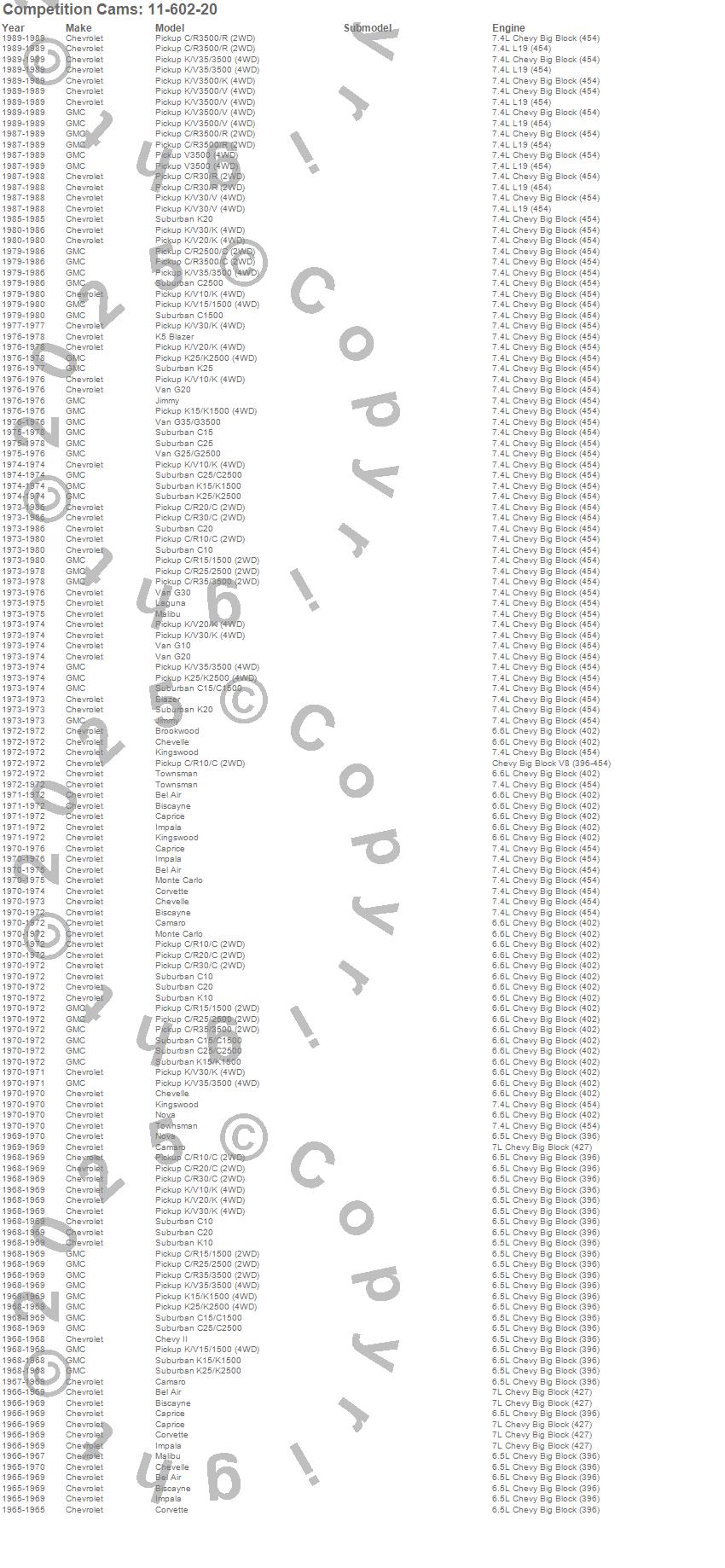 Bel Air, Biscayne, Blazer, Blazer K5, Brookwood, C10 Pickup, C10 Suburban, C15 Suburban, C15/C1500 Suburban, C1500 Pickup, C1500 Suburban, C20 Pickup, C20 Suburban, C25 Suburban, C25/C2500 Pickup, C25/C2500 Suburban, C2500 Pickup, C2500 Suburban, C30 Pickup, C35/C3500 Pickup