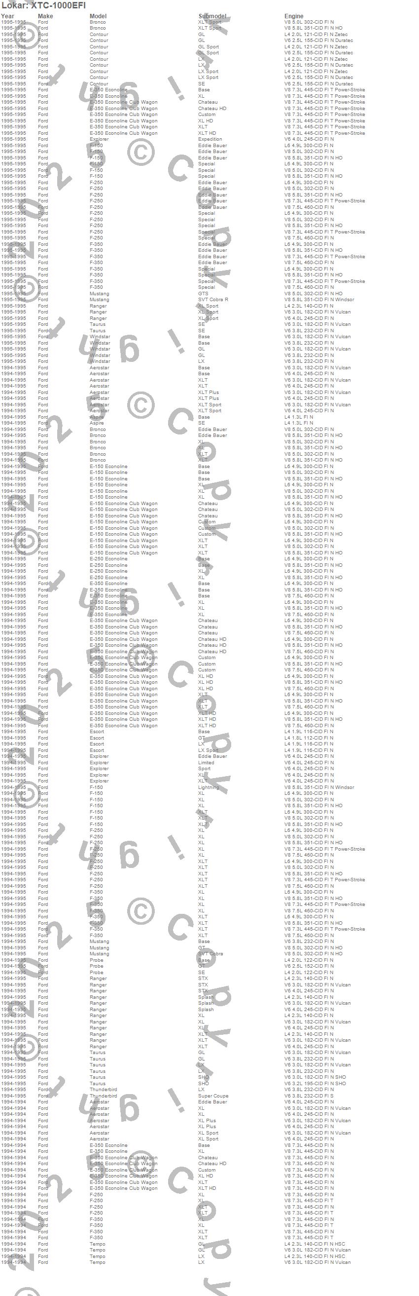 Aerostar, Aspire, Bronco, Contour, E-150 Econoline, E-150 Econoline Club Wagon, E-250 Econoline, E-350 Econoline, E-350 Econoline Club Wagon, Escort, Explorer, F-150, F-250, F-350, Mustang, Probe, Ranger, Taurus, Tempo, Thunderbird