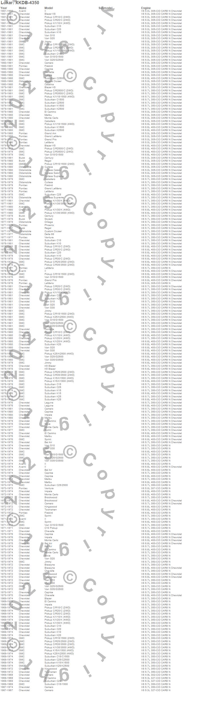 Bel Air, Biscayne, Blazer, Blazer K5, Brookwood, C10 Pickup, C10 Suburban, C15 Suburban, C15/C1500 Suburban, C1500 Pickup, C1500 Suburban, C20 Pickup, C20 Suburban, C25 Suburban, C25/C2500 Pickup, C25/C2500 Suburban, C2500 Pickup, C2500 Suburban, C30 Pickup, C35/C3500 Pickup