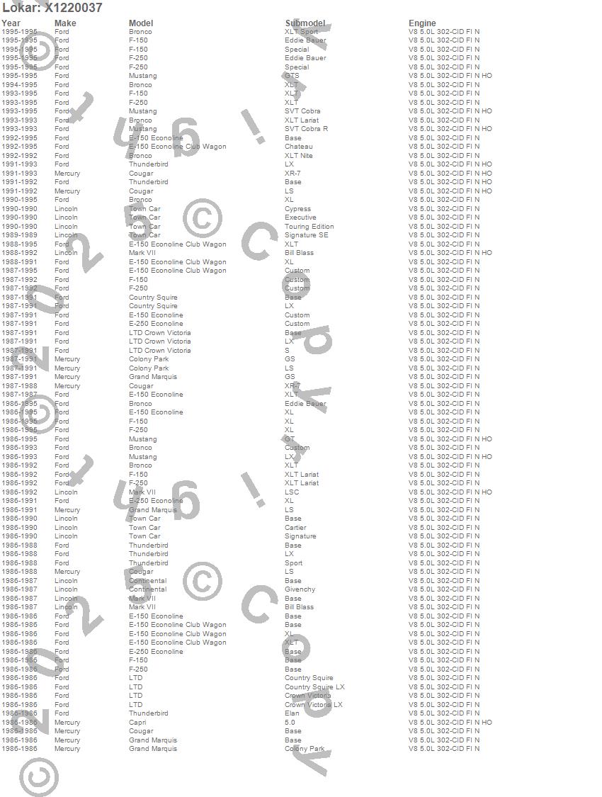 Bronco, Capri, Colony Park, Continental, Cougar, Country Squire, E-150 Econoline, E-150 Econoline Club Wagon, E-250 Econoline, F-150, F-250, Grand Marquis, LTD, LTD Crown Victoria, Mark VII, Mustang, Thunderbird, Town Car, Ford, Lincoln
