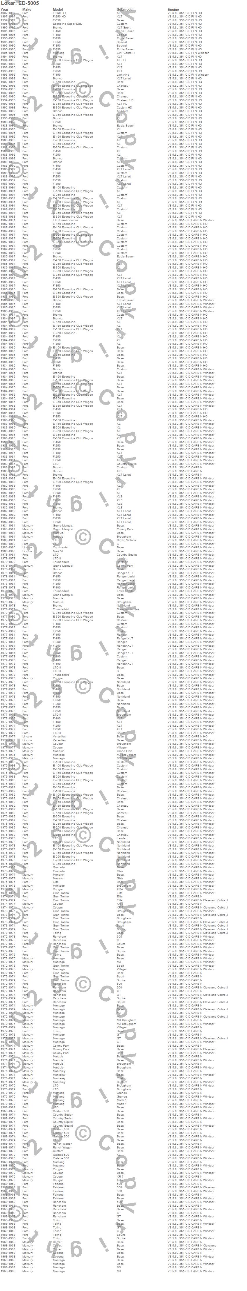 Bronco, Colony Park, Comet, Continental, Cougar, Country Sedan, Country Squire, Custom, Custom 500, Cyclone, E-100 Econoline, E-100 Econoline Club Wagon, E-150 Econoline, E-150 Econoline Club Wagon, E-250 Econoline, E-250 Econoline Club Wagon, E-350 Econoline, E-350 Econoline Club Wagon, Econoline Super Duty, Elite