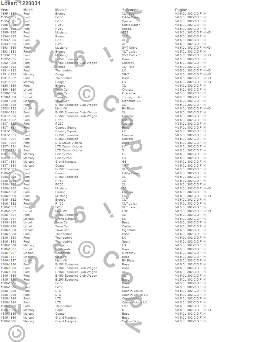 Bronco, Capri, Colony Park, Continental, Cougar, Country Squire, E-150 Econoline, E-150 Econoline Club Wagon, E-250 Econoline, F-150, F-250, Grand Marquis, LTD, LTD Crown Victoria, Mark VII, Mustang, Thunderbird, Town Car, Ford, Lincoln