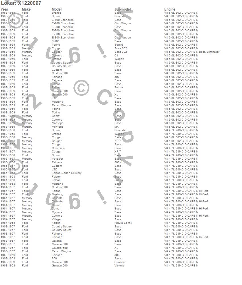 300, Bronco, Caliente, Comet, Commuter, Cougar, Country Sedan, Country Squire, Custom, Custom 500, Cyclone, E-100 Econoline, E-200 Econoline, E-300 Econoline, F-100, Fairlane, Falcon, Falcon Sedan Delivery, Galaxie, Galaxie 500